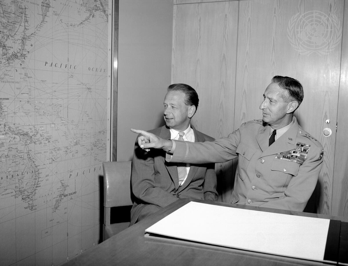 Here, General Clark points to a detail on a large wall map, as Secretary-General Dag Hammarskjöld looks on.