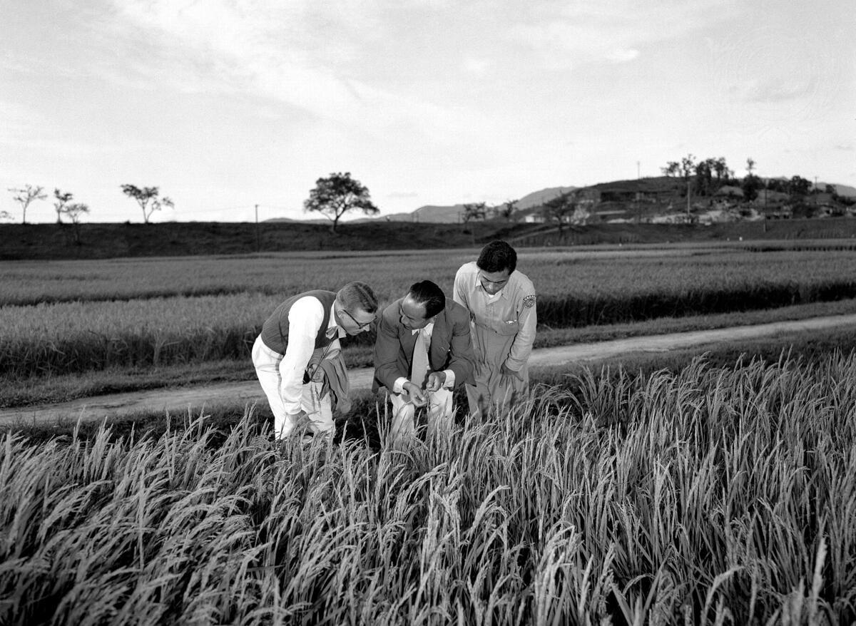 A twelve-man team of agricultural experts, jointly sponsored by the United Nations Korean Reconstruction Agency (UNKRA) and the UN Food and Agriculture Organization (FAO) is now in Korea and has begun its six-month assignment of developing a five-year agricultural rehabilitation program in Korea. Among the places visited by the team was the Suwon Experimental Agricultural Farm, where this photograph was taken as Mr. Mark Williamson (left), Head of the Mission, was being shown one of the many varieties of rice grown on the farm.