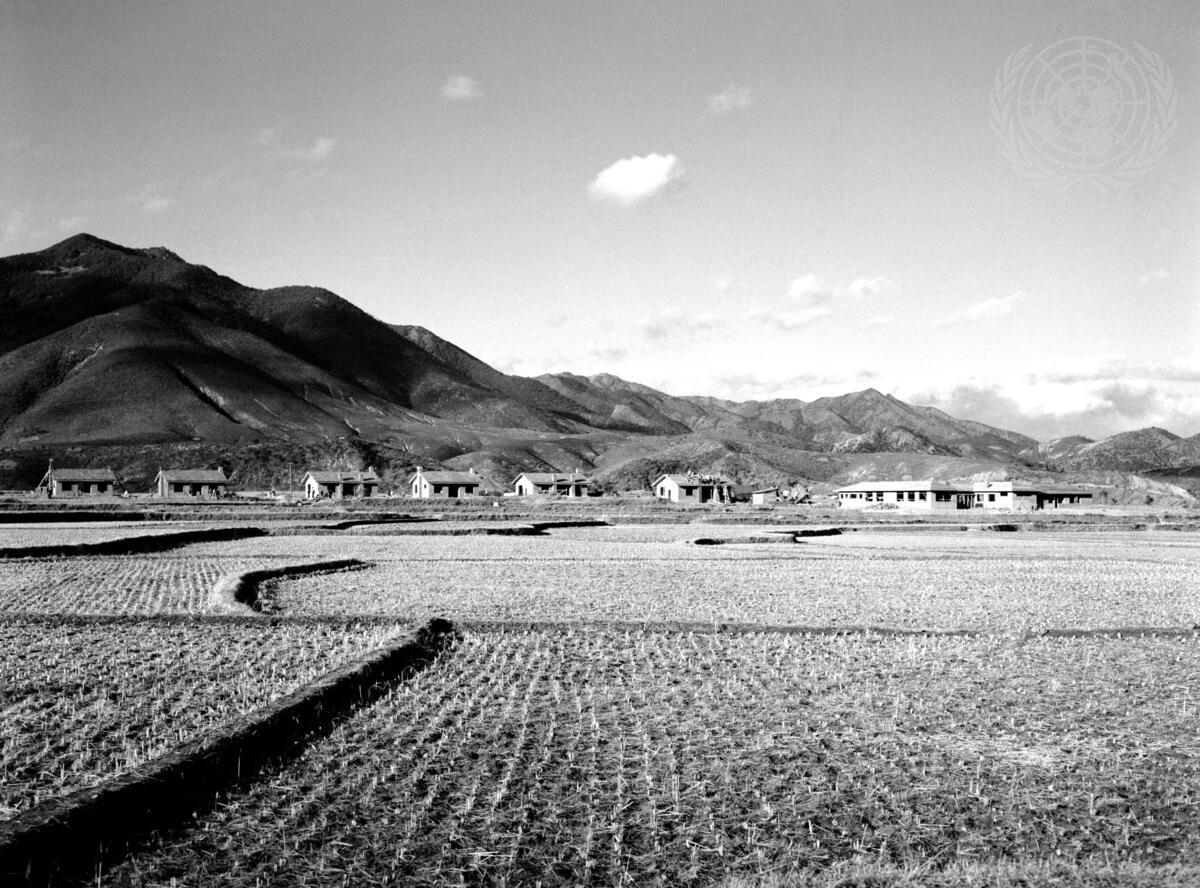 A new community, including 148 homes, bachelors' quarters, a school and a community center is being built on paddy land adjacent to the village of Sinki-ri, to house the 800 persons who will work at the Mungyong cement plant, now under construction by the UN Korean Reconstruction Agency (UNKRA).