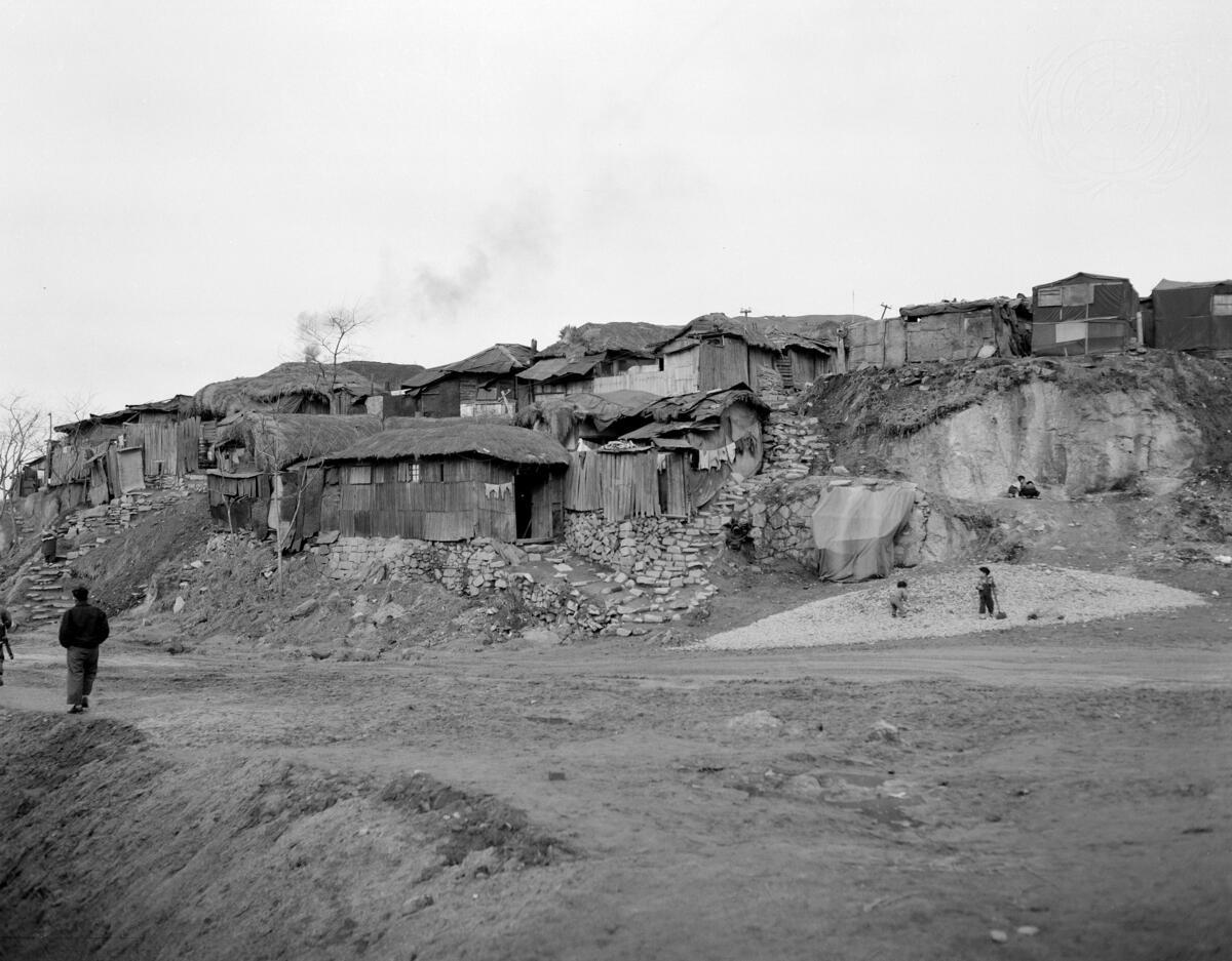 To help relieve the acute housing shortage caused in Korea by the war, the UN Korean Reconstruction Agency (UNKRA) is carrying out an overall housing program in 33 cities throughout the country. UNKRA has allocated $4,500,000 for building materials and also given technical assistance in the various types of construction. The largest number of houses are of cottage type and constructed according to the earth block system. For this program, UNKRA brought from South Africa Landcrete machines, which make strong, durable building blocks out of a mixture of earth and cement in proportions of about 15 to one. A new type of housing - two-story terraced houses - was introduced recently. 1,000 of these units have been erected already in the Seoul suburbs, standing above the traditional Korean cottages with their oriental roofs, and the emergency shacks (such as those shown here) that mushroomed during and after the war.