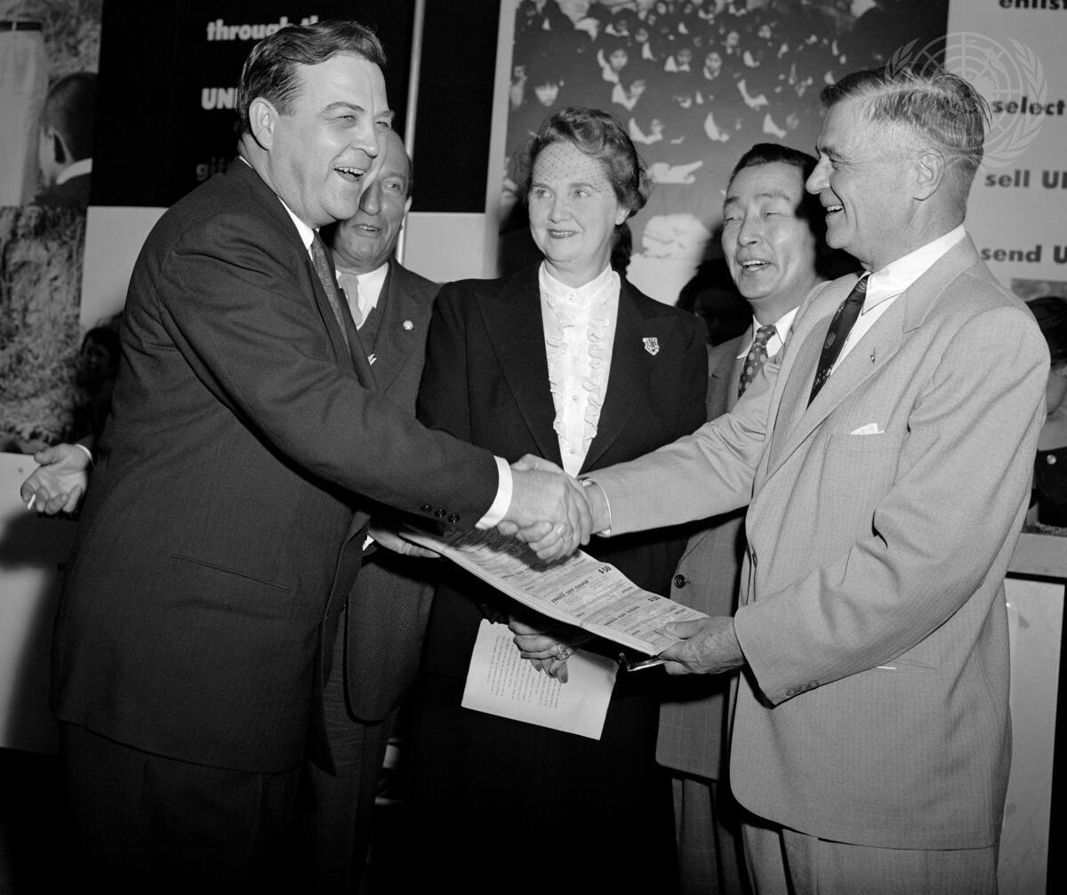 Seen here at the presentation ceremony, Dr. Luther Evans (left), Director-General of UNESCO, congratulates Lt. Gen. John B. Coulter (right), Agent-General of UNKRA. Looking on, from left to right, are: Mr. Benjamin Cohen, Assistant Secretary-General of the UN, in charge of Public Information, who acted as Master of Ceremonies; Mrs. Honorio Roight, President of the UN Women's Guild; and Col. Ben C. Limb, Permanent Observer of Korea to the United Nations.