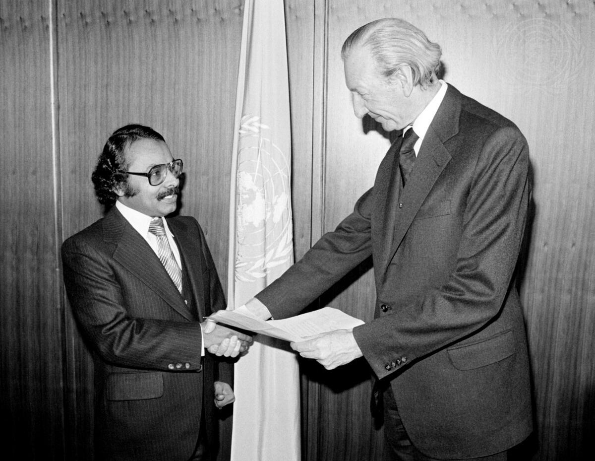 Ahmed Ali Al-Haddad (left), the new Permanent Representative of Yemen to the United Nations, presenting his credentials to Secretary-General Kurt Waldheim at UN Headquarters.