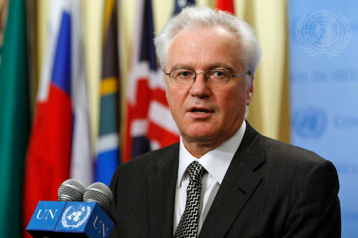 Vitaly Churkin, Permanent Representative of the Russian Federation to the United Nations, briefs correspondents following an emergency Security Council meeting on the current crisis in Georgia.