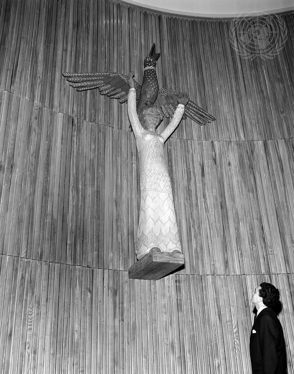 Mr. Lucien De Groote, of Brussels, Belgium, one of the ten winners of this year's International Essay Competition, looks at a statue symbolizing Mankind and Hope which is part of the decoration of the Trusteeship Council chamber at the United Nations Headquarters. The statue which stands nine and one half feet high, was carved out of teak wood by Mr. Starcke, a Danish sculptor. It stands on a pedestal near the window, and represents a girl with arms upraised, reading towards a bird which hovers with outspread wings above her head.