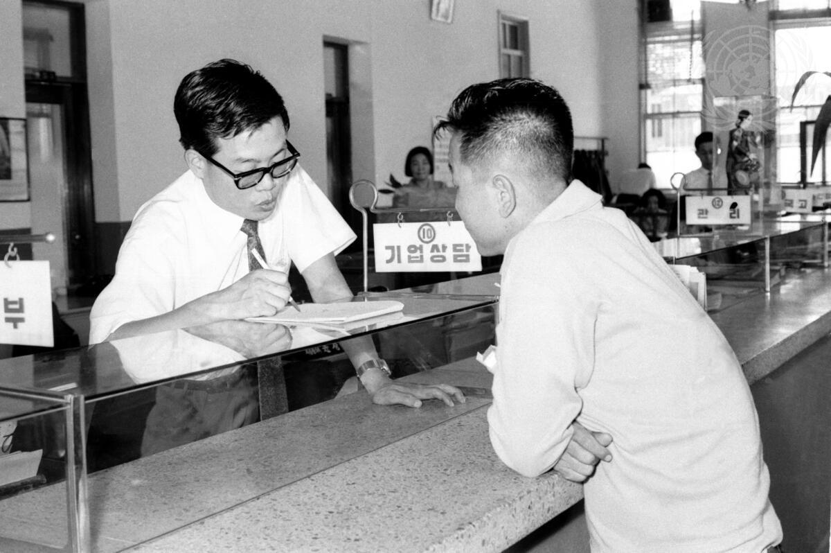 A Medium Industry Bank clerk is seen here assisting a client who seeks assistance from the Extension Services Department. [1969]