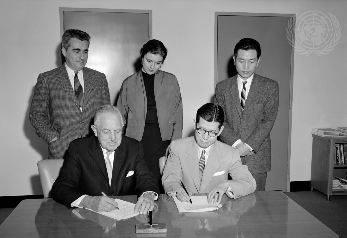Seen here, signing the agreement (left to right): Mr. Paul G. Hoffman and Ambassador Channing Liem. Looking on are: Mr. Paul-Marc Henry, Associate Director, Bureau of Operations, Special Fund; Miss P. Guillebaud, Project Officer, Bureau of Operations, Special Fund; and Mr. Hyuck Kim of the Republic of Korea.