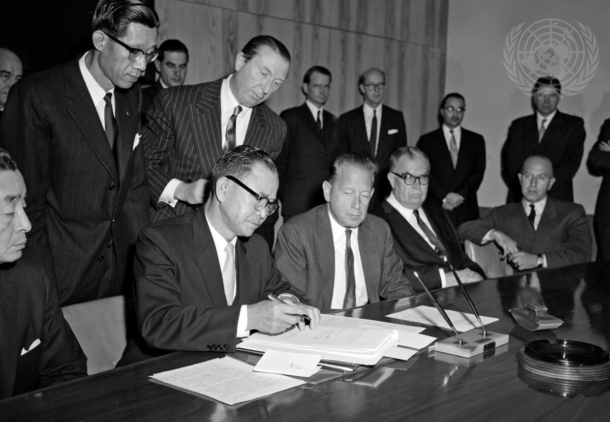 A brief ceremony in the office of UN Secretary-General Dag Hammarskjöld marked the signing today of an Agreement granting to the United Nations permanent use of the site of the UN Memorial Cemetery in Tang-Gok, near Pusan, in the Republic of Korea. Seen here as he was about to sign the Agreement on behalf of his Government is Dr. Chung W. Cho (2nd from left, at table), Minister of Foreign Affairs of the Republic of Korea. At the table with him are (left to right): Ambassador Ben C. Limb, Korea's Permanent Observer to the UN; Mr. Hammarskjöld; Sir Leslie Munro (New Zealand), who represented the UN Secretary-General in Korea; and Mr. Constantin A. Stavropoulos, UN Legal Counsel. Standing behind Dr. Cho are Col. Soo Young Lee (left), Counsellor, Office of the Permanent Observer of Korea to the UN; and Mr. Jehan de Noue, UN Chief of Protocol.