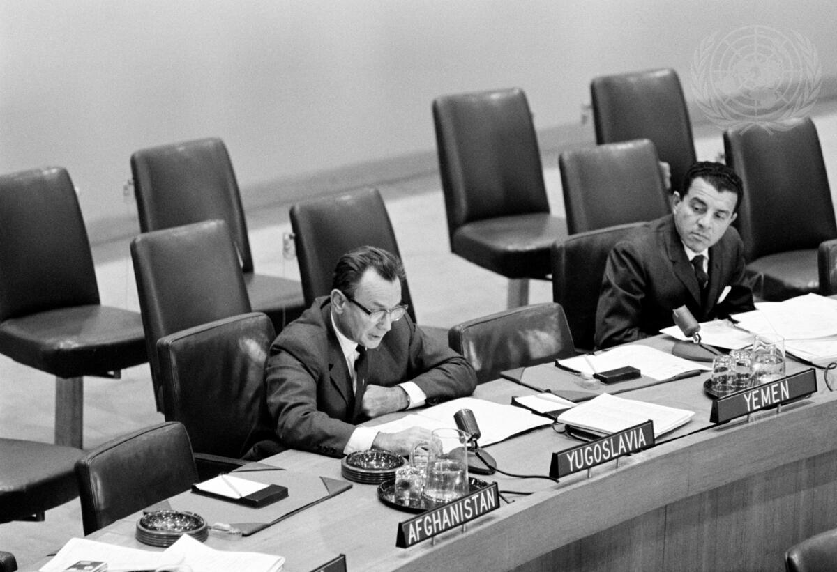 Mr Sreten Ilic (left) of Yugolsavia is addressing the Committee. At right is Dr. Tulio Alvarado of Venezuela.