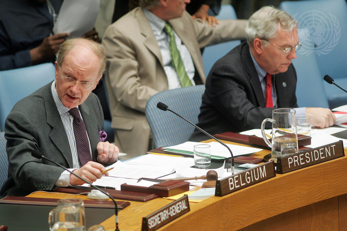 Jan Grauls (left), Permanent Representative of Belgium to the United Nations and President of the Security Council for August, flanked by B. Lynn Pascoe (right), Under-Secretary-General for Political Affairs, addresses a Security Council meeting reviewing a report of the Secretary-General on the fulfillment of the responsibilities of the United Nations Assistance Mission in Iraq.