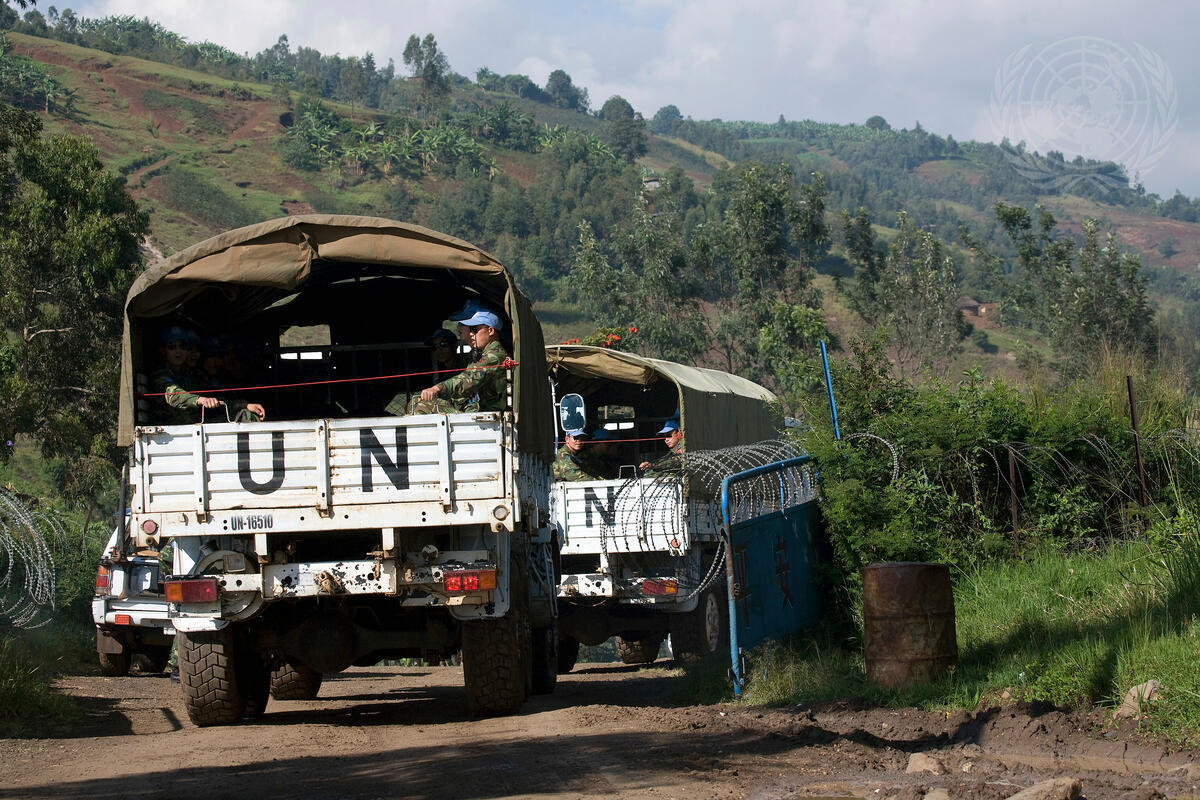 United Nations Organization Mission in the Democratic Republic of the Congo (MONUC) trucks transport the military personnel of the Chinese engineering company of the (MONUC) to the 1.8 kilometer-long road rehabilitation project enabling greater access to the Ruzizi One Dam Power Plant, the only source of electricity for the east of the country.