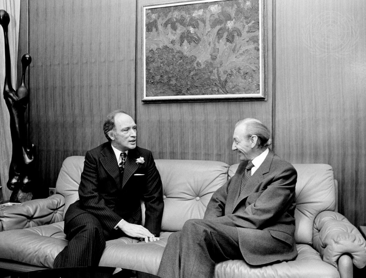 Prime Minister Pierre-Elliott Trudeau (left) of Canada conferring with Secretary-General Kurt Waldheim, during his visit to United Nations Headquarters today.