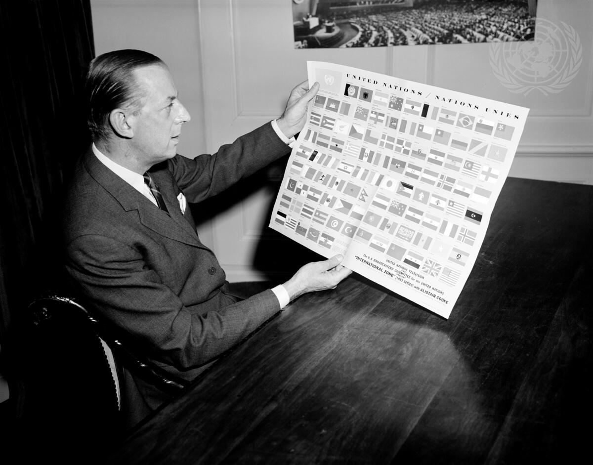 Mr. Cooke is viewing the new issue of United Nations Flag-sheet, with replicas of flags of the 99 member nations of the U.N.