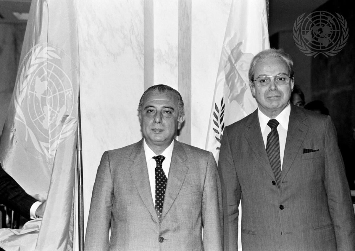 Secretary-General Javier Pérez de Cuéllar (right), and President Spyros Kyprianou of Cyprus, as the President prepares to leave UN Headquarters today.