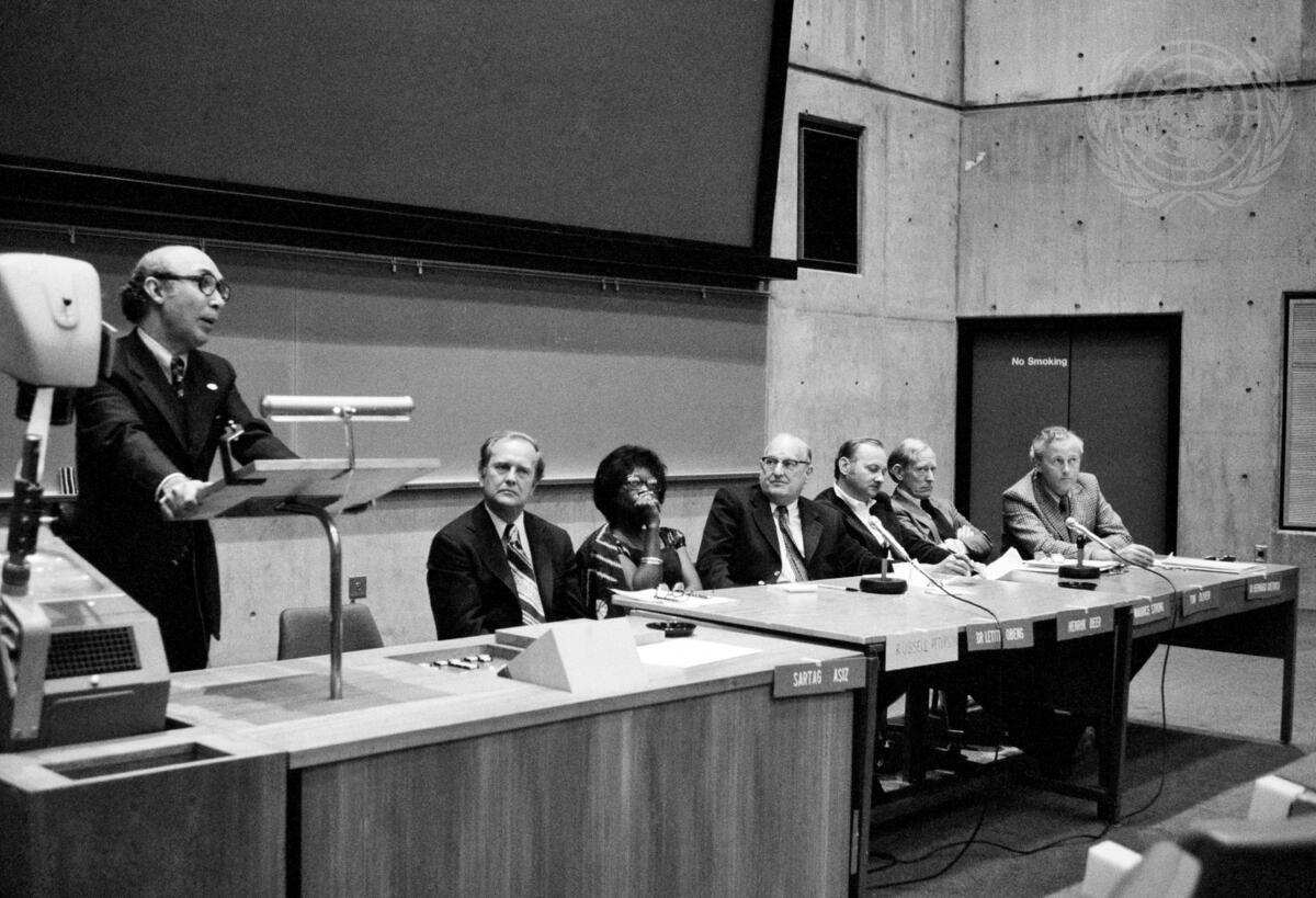 Sartag Aziz of the World Food Council is addressing a Water Symposium held in connection with the Habitat Conference. Other members of the panel (l to r) are: Russell Peterson, Chairman, Council of Environmental Quality, Executive Office of the President of the United States; Mrs. Leticia Obeng, Senior Information Officer, Bureau of Programmes, UN Environment Programme (UNEP); Dr. Henrik Beer of the International Red Cross; Maurice Strong, former Executive Director of UNEP; Thomas W. Oliver, Executive Secretary, UN Water Conference in 1977; and Dr. B.H. Dieterich of the World Health Organization.