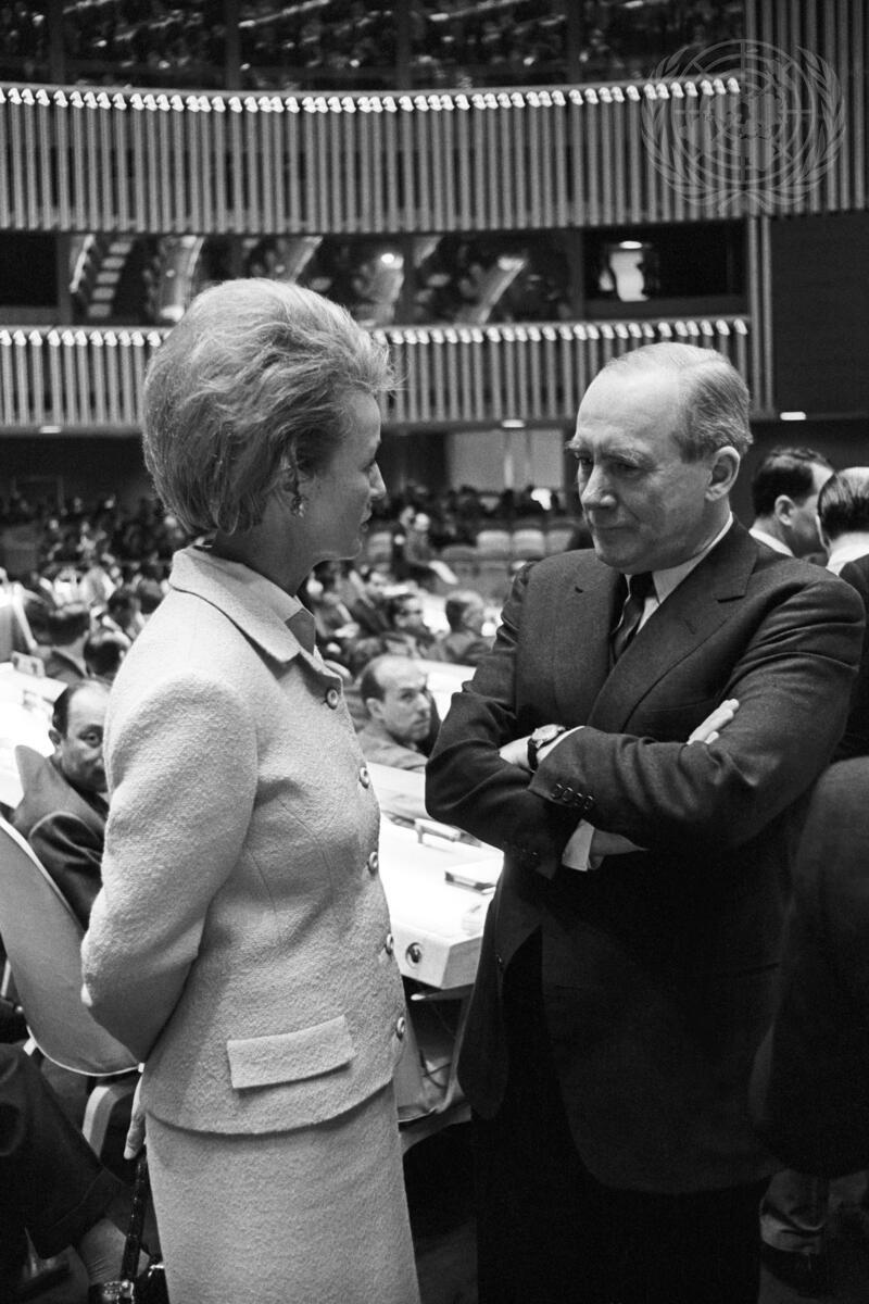 Mrs. Marietta Tree of the United States, conversing with Lord Caradon of the United Kingdom, before the meeting began.