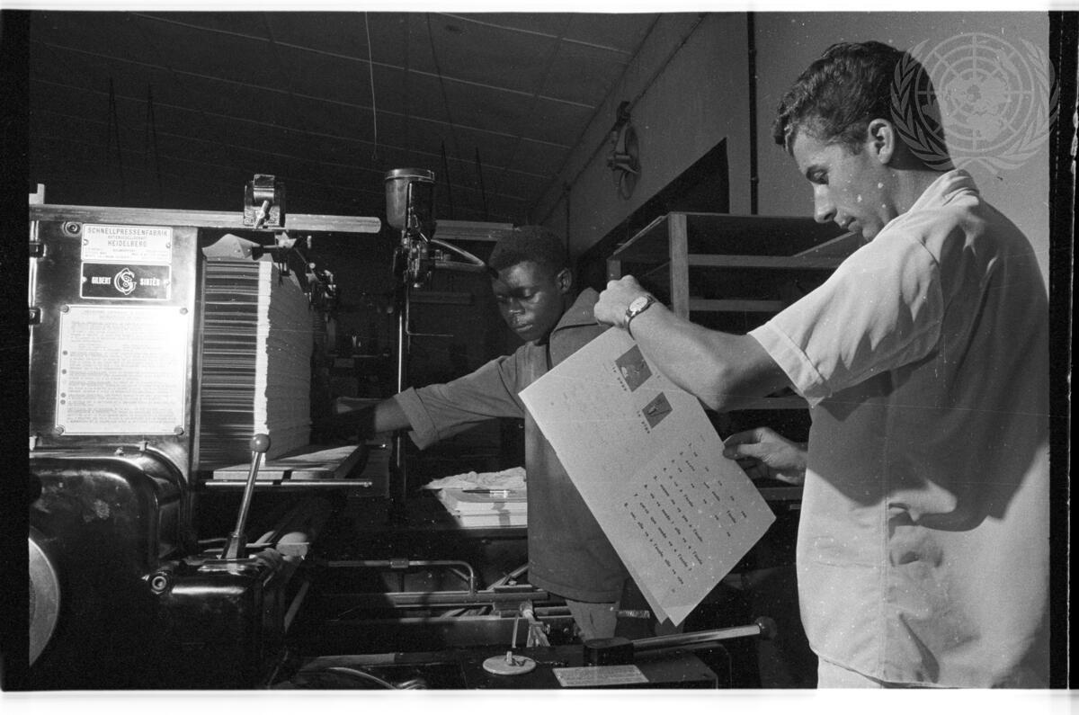 Assisting a Cameroonian printer is UNESCO Expert in Book Binding, Mr. A. Walter (Federal Republic of Germany) (right). [Exact date unknown]