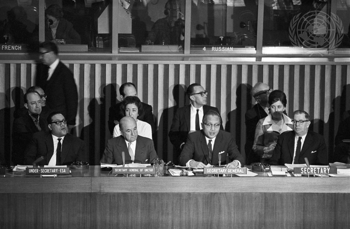 Secretary-General U Thant opening the session. At the table, from left: Mr. I.H. Abdel-Rahman, Commissioner, Centre for Industrial Development. Dr. Raul Prebisch, Secretary-General of the UN Conference on Trade and Development; U Thant; and Mr. Perce Judd (Secretariat of the UN Conference on Trade and Development), Secretary.