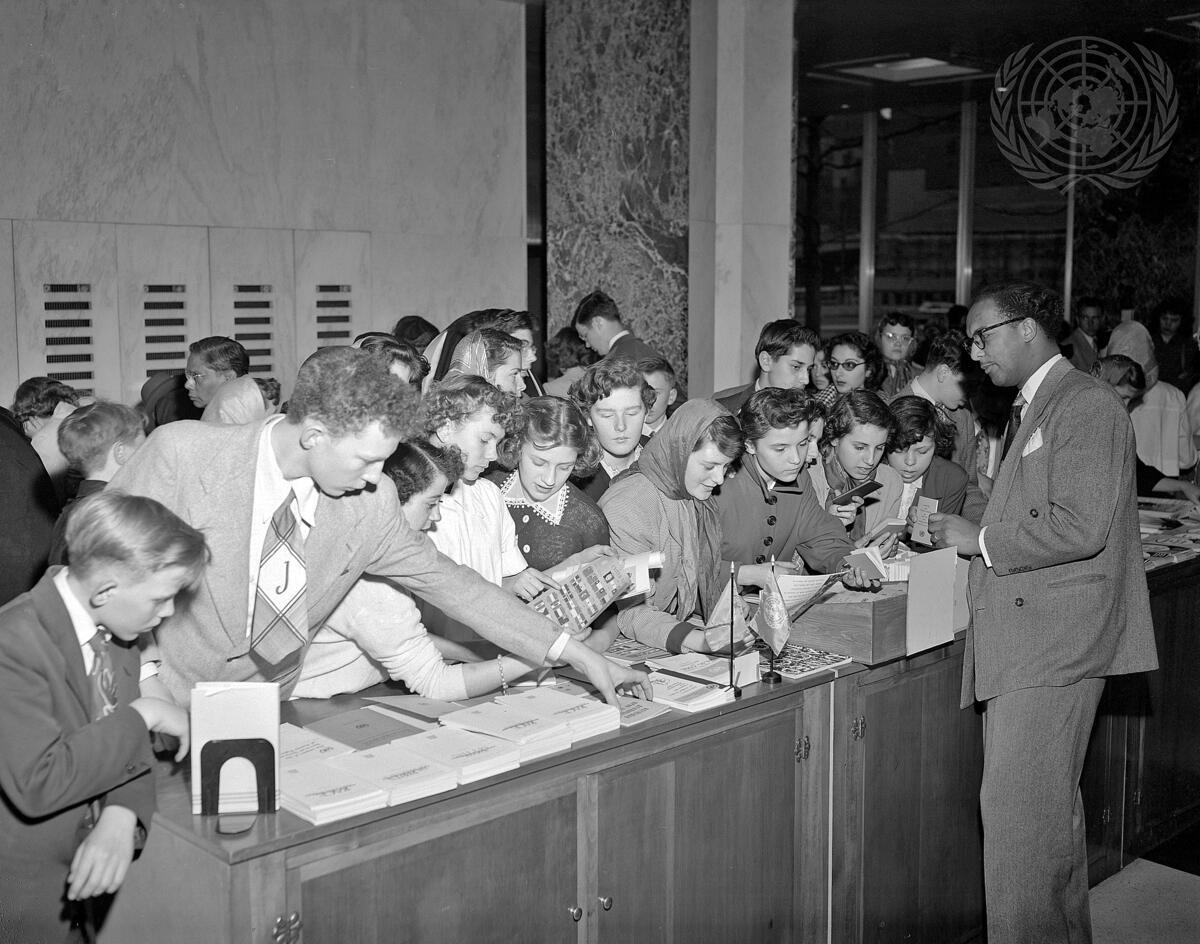 Young visitors to the permanent Headquarters of the United Nations in New York looking over posters, leaflets and books at the provisional bookshop for UN publications which is located in the main lobby of the Secretariat building.