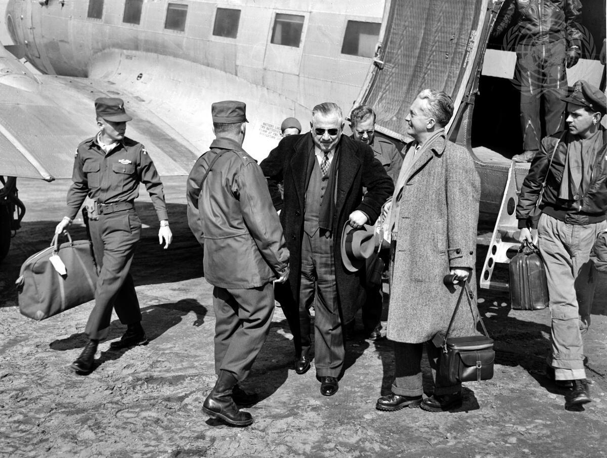 In March 1952, Mr. Andrew W. Cordier, Executive Assistant to the Secretary-General of the United Nations, visited UN forces in Korea.