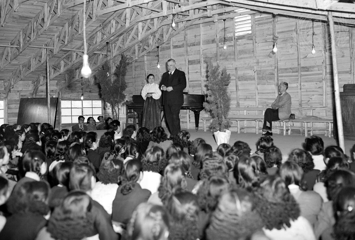 Here Mr. Cordier is seen standing on the platform during his address. At his side is Dr. Helen Kim, Head of the College. [No exact date]