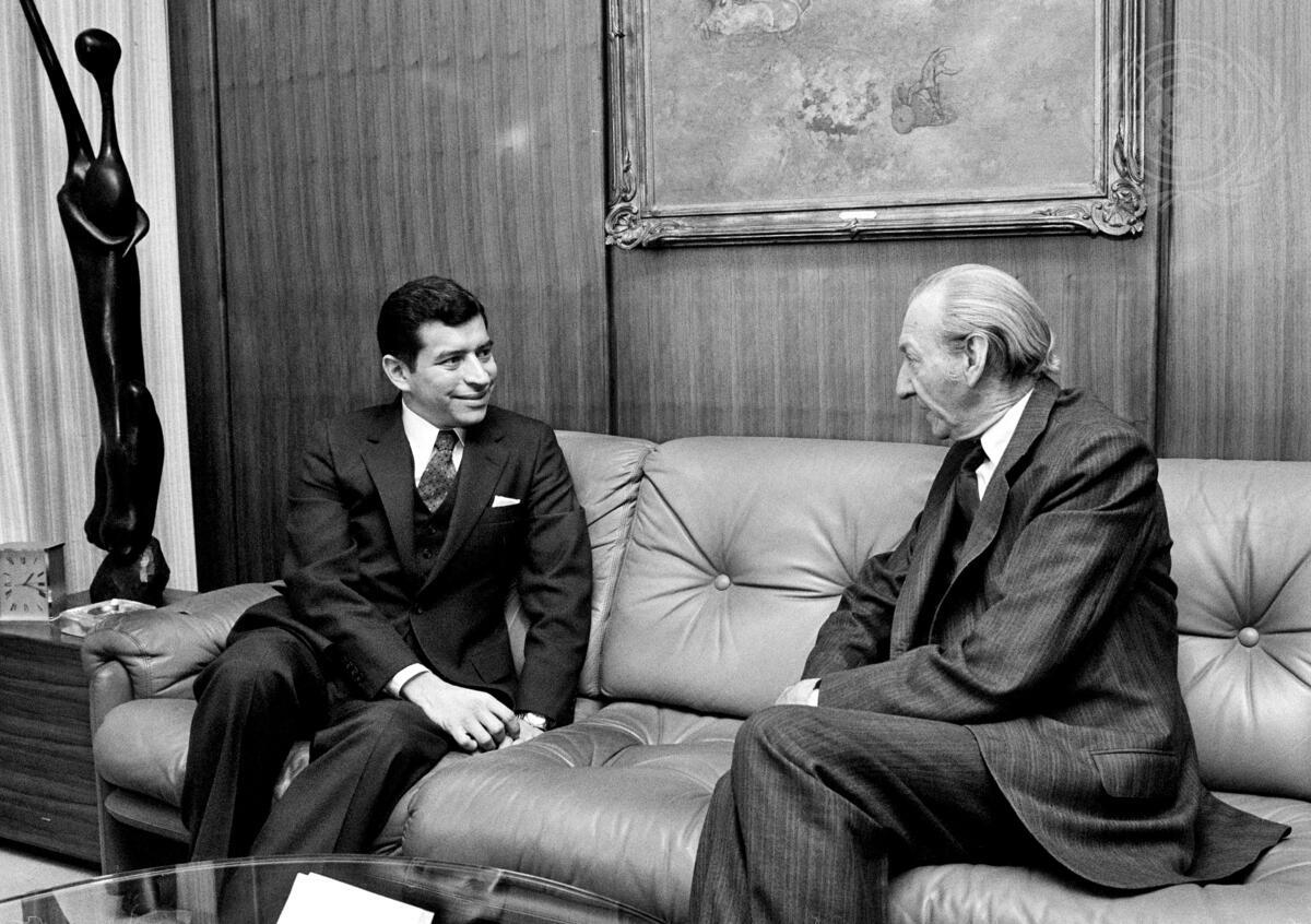 United Nations Secretary-General Kurt Waldheim (right) meeting with Carlos Lopes Contreras, Under-Secretary of Foreign Affairs of Honduras, at UN Headquarters today.