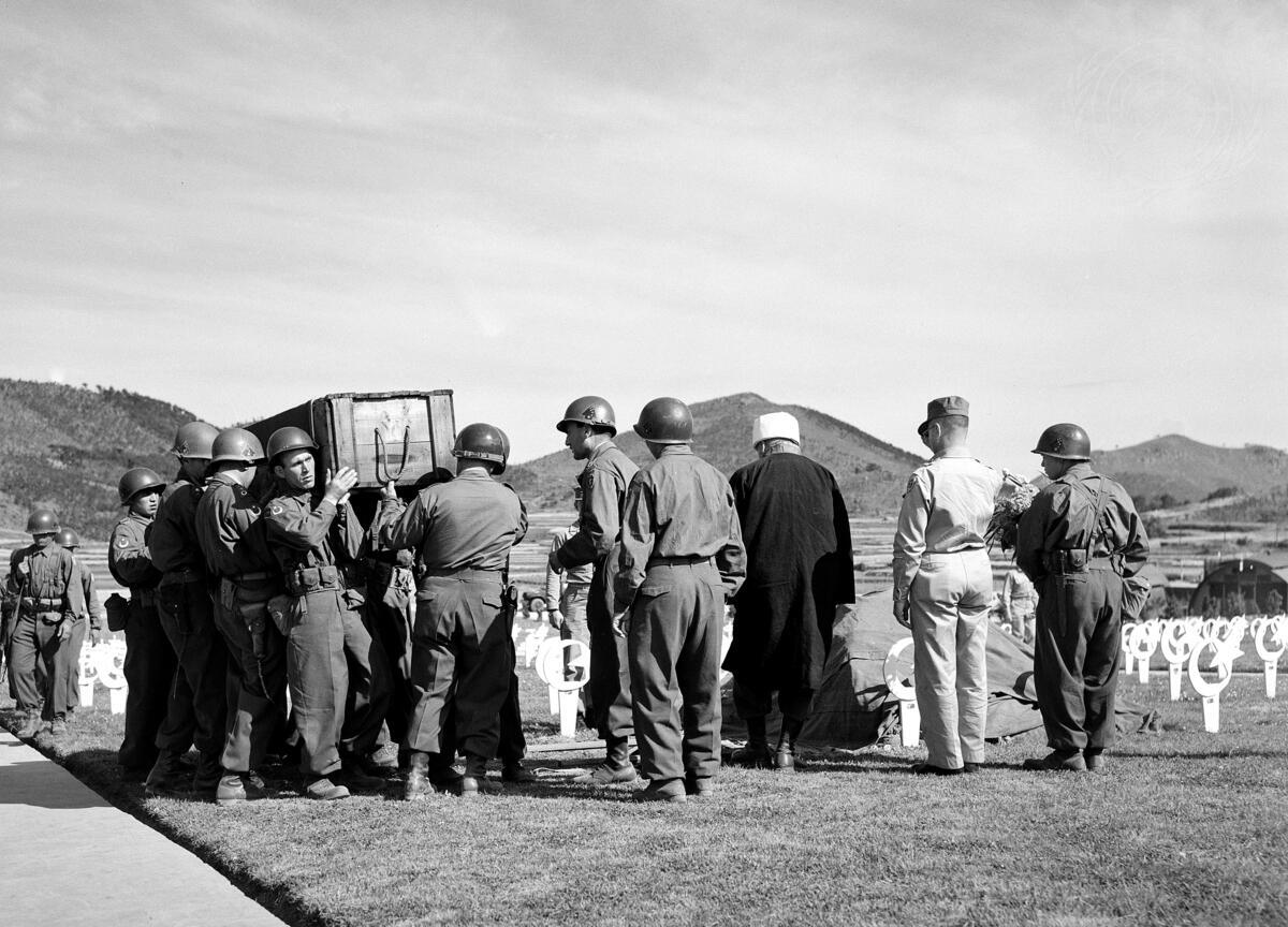 Col. Nauri Pamir, Deputy Commander of the Turkish forces in Korea, was killed in action on 5 June 1952. This picture was taken during the burial ceremony, in the Turkish Section of the UN Military Cemetery in Pusan. Col. Pamir is the highest ranking Turkish officer killed in the Korean War.