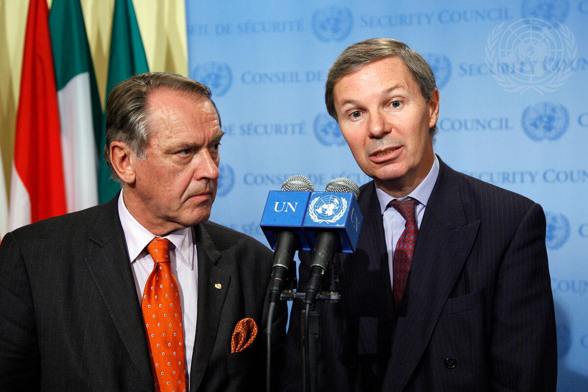 Jean-Marie Guéhenno, Under-Secretary-General for Peacekeeping Operations, flanked by Jan Eliasson, United Nations Special Envoy for Darfur, addresses journalists, following a Security Council meeting on the current situation in the Sudan.