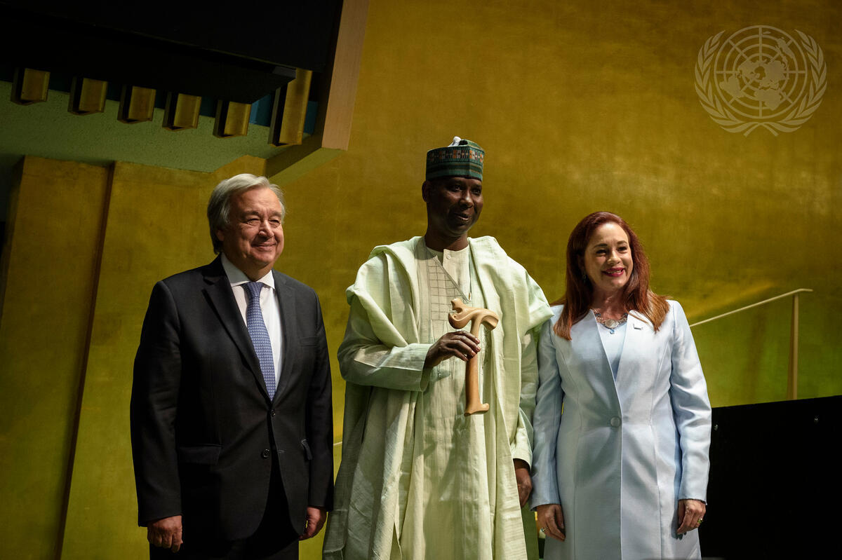 María Fernanda Espinosa Garcés (right), President of the seventy-third session of the General Assembly, hands over the gavel to Tijjani Muhammad-Bande (centre), President of the seventy-fourth session of the General Assembly, after the closing plenary meeting of the seventy-third session of the General Assembly. At left is Secretary-General António Guterres.