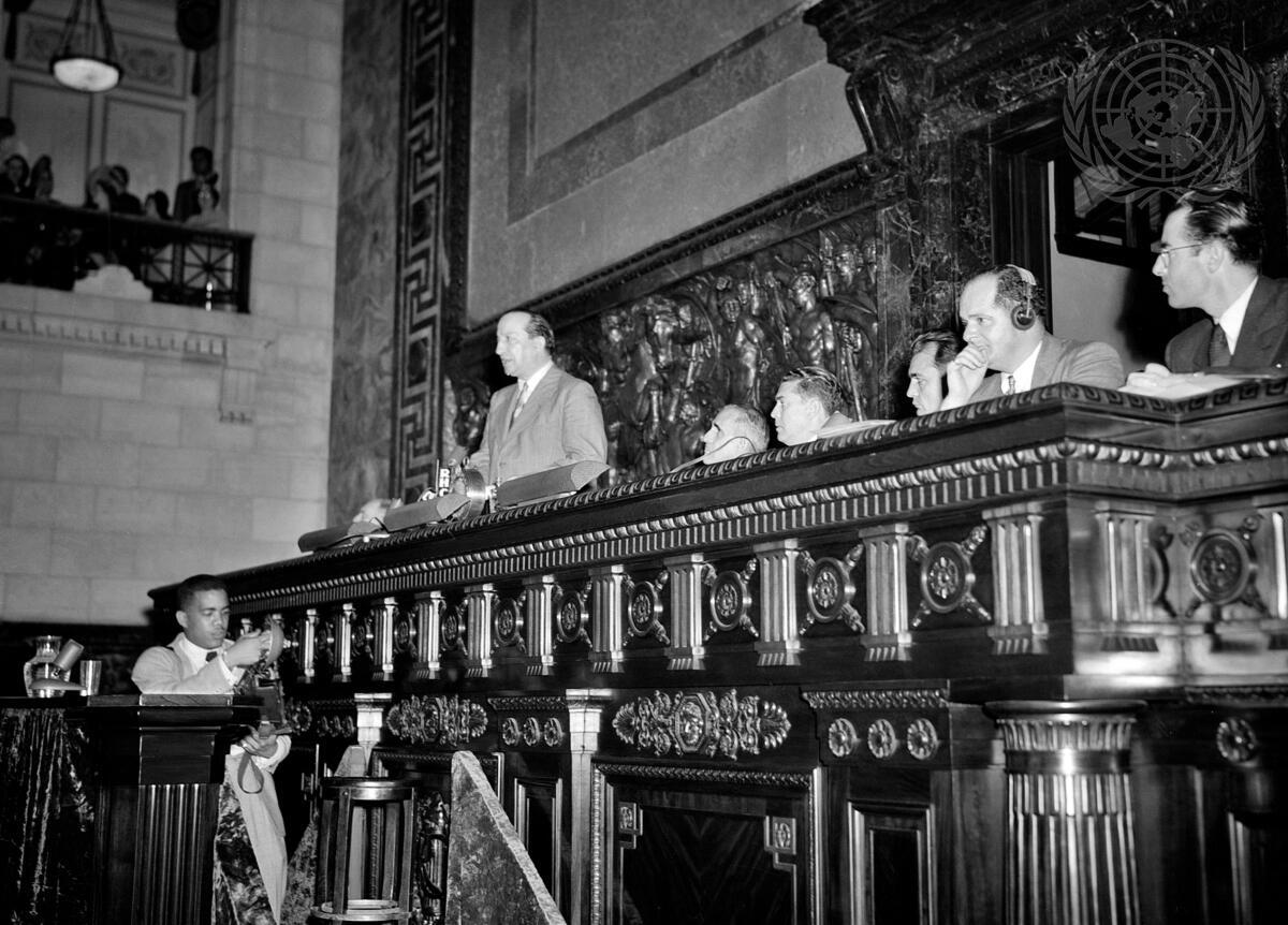 Benjamin Cohen, Assistant Secretary-General in charge of Public Information, addresses the inaugural meeting of the United Nations Conference on Trade and Employment in Havana's Capitolio. Seated on the rostrum, left to right, are: President of the Republic of Cuba, Ramon Grau San Martin, Miguel A. Suarez, President of Cuba Senate; Ruben de Leon, President of the Cuban House of Representatives, and Eric Wyndham-White, Executive Secretary of the Conference. The purpose of the Conference, attended by representatives of more than 60 countries, including 51 Member States of the United Nations, is to establish the proposed International Trade Organization (I.T.O.).