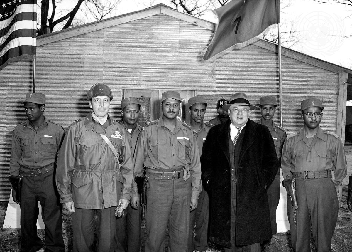 On March 21st, during his recent trip to Korea, Mr. Andrew W. Cordier, Executive Assistant to the Secretary-General of the United Nations, visited the Ethiopian Battalion fighting with the Unified Forces. This picture shows (left to right) Major-General L. L. Lemnitzer, Commanding Officer of the 7th Division; Lt. Col. Teskome Irgetu, Commander of the Ethiopian Battalion; and Mr. A. Cordier, photographed with officers of the Battalion.