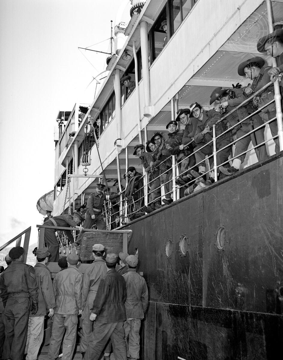 A new battalion of the Royal Australian Regiment arrives in Pusan to join the Unified Forces in Korea. Seen here, men of the battalion wait on deck while gangplank is being adjusted for disembarkation. Australia has another battalion and a jet fighter squadron operating in Korea.