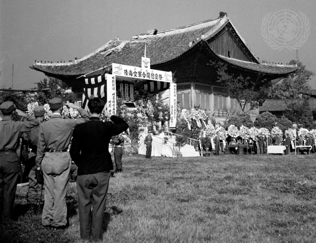 In the grounds of the Duck Soo Palace, in Seoul, a ceremony is held in honour of the South Koreans casualties of war. In the center, the platform from which representatives of the United States and Republic of Korea services made their speeches. The building in the background is the ancient throne room of the Palace which was built some 300 years ago.