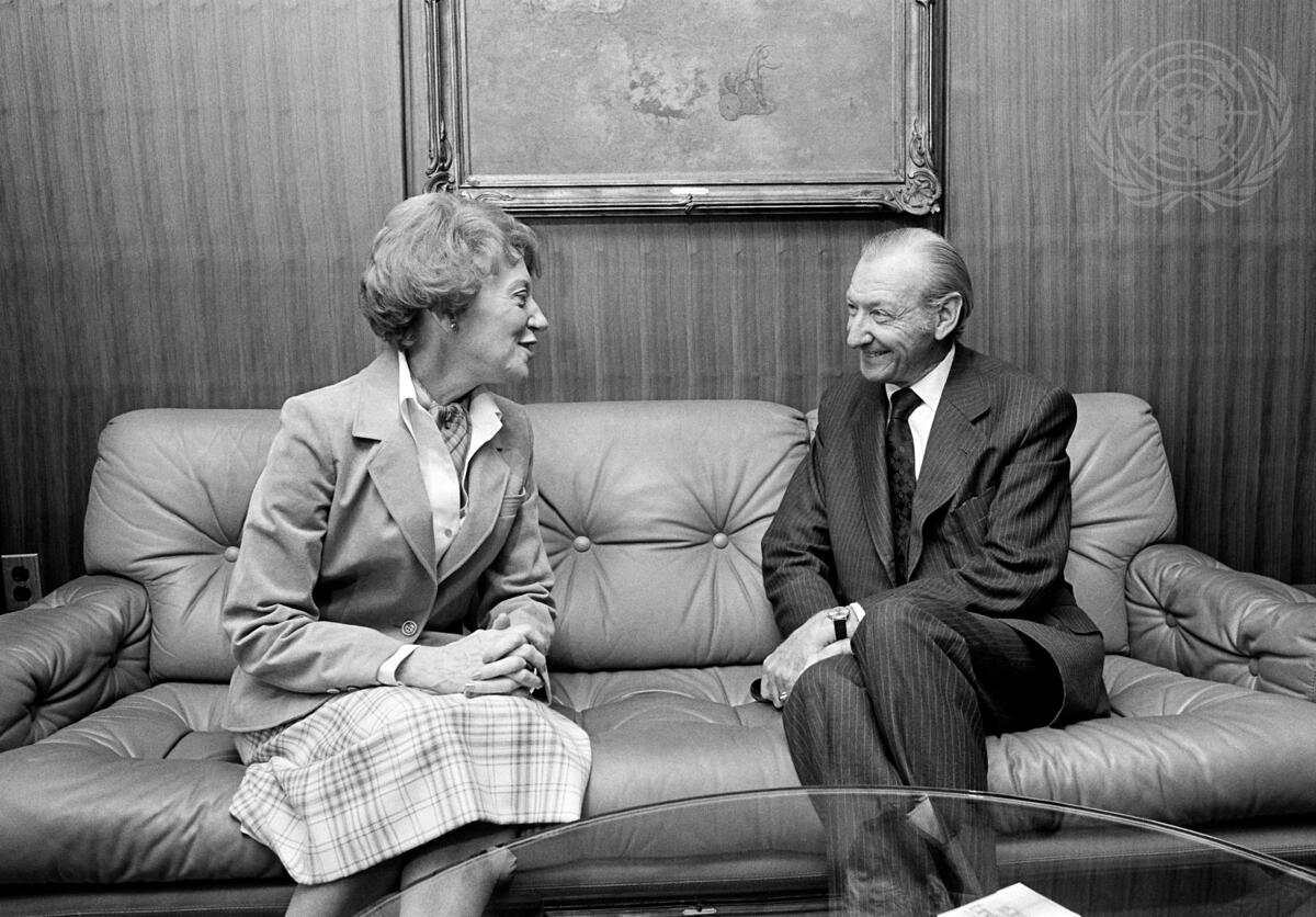 Secretary-General Kurt Waldheim meets with Flora MacDonald, Minister for Foreign Affairs of Canada, at UN Heaquarters today.