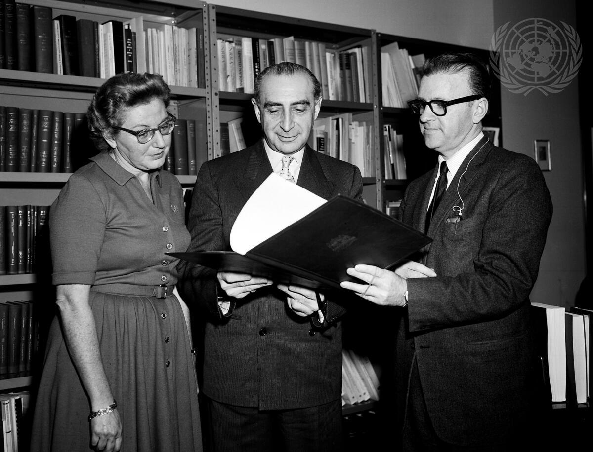 Seen here as he deposited the instrument of ratification, Ambassador Palamas (centre) is flanked by Miss Aline Cohn, Representative in the United States of the UN High Commissioner for Refugees, and Mr. Oscar Schachter, Director of the General Legal Division, in charge of the UN Office of Legal Affairs.