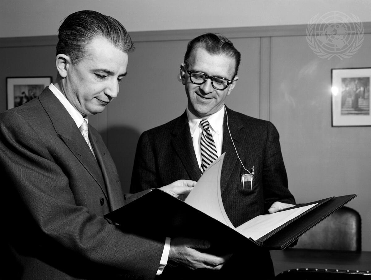 Ambassador Dobrovoje Vidic (left), Permanent Representative of Yugoslavia to the United Nations, is seen here depositing the document with Oscar Schachter, Director of the UN General Legal Division.