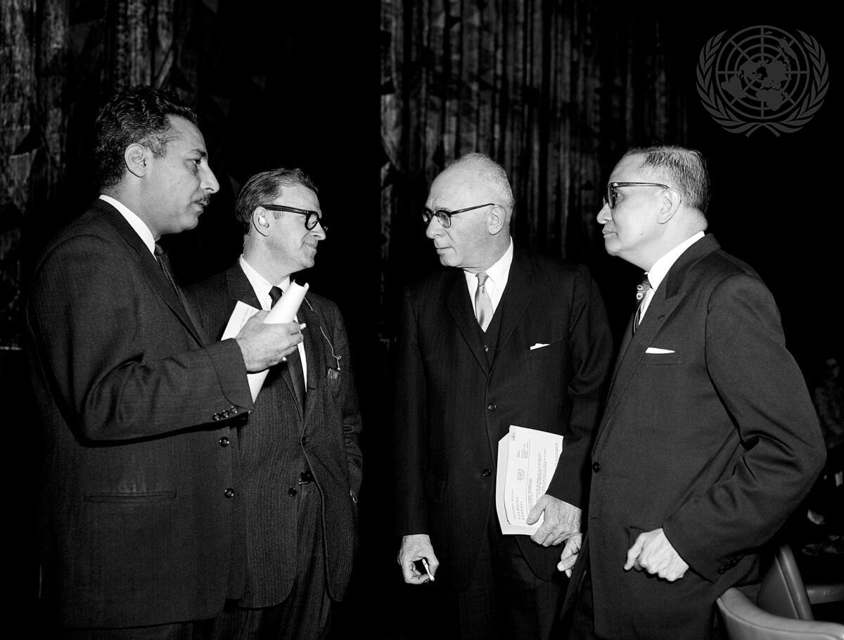 Seen here as they exchanged views in the conference shortly before the United Nations Commission on Permanent Sovereignty over Natural Resources opened its second session this morning are Messrs. (l. to r.) : Abdul Rahman Pazhwak (Afghanistan); Oscar Schachter, of the United Nations Office of Legal Affairs; Daniel Schweitzer (Chile); and Dr. Melquiades J. Gamboa (Philippines), Chairman of the Commission.