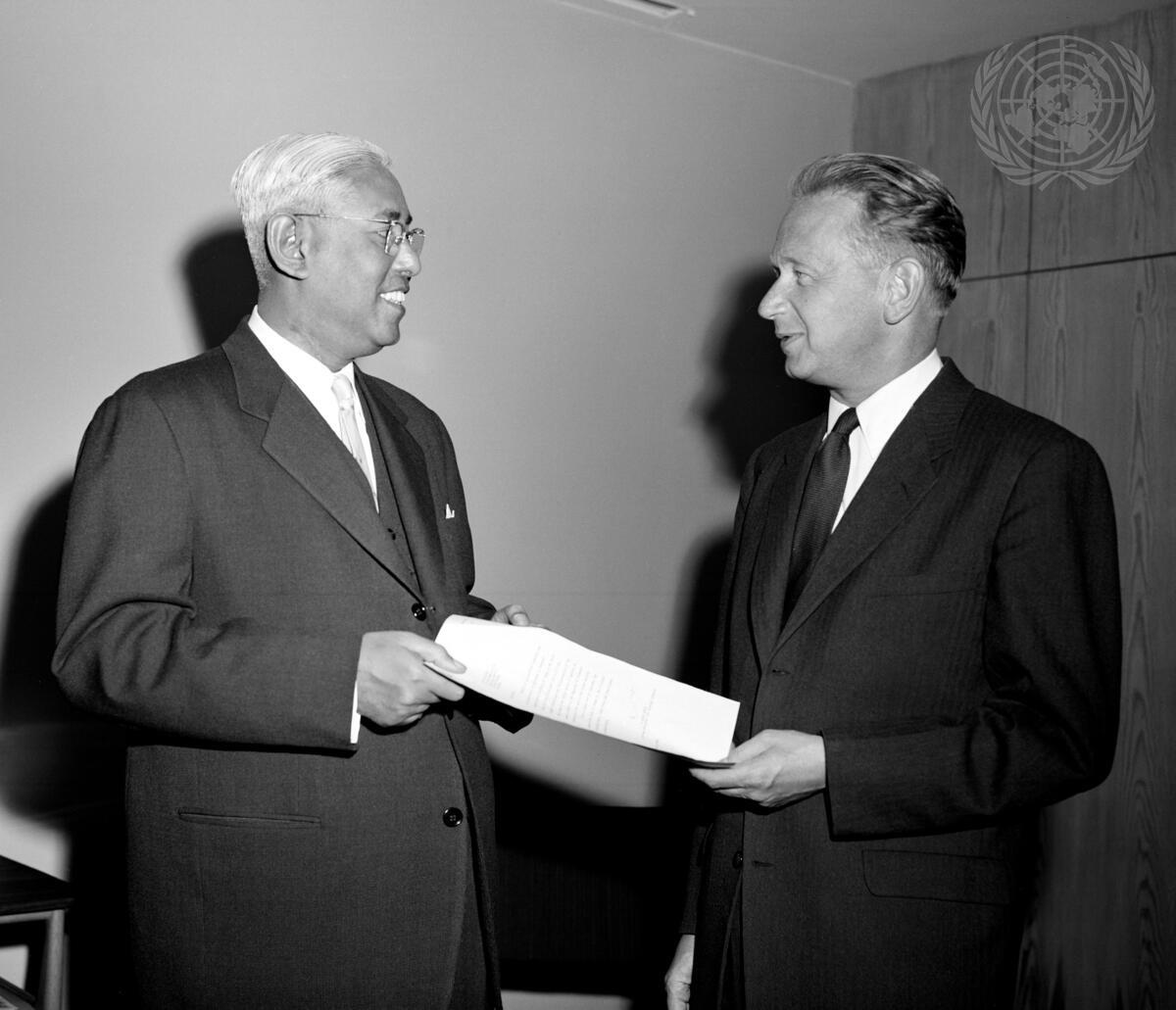 (left), presents his credentials to Secretary-General Dag Hammarskjöld.