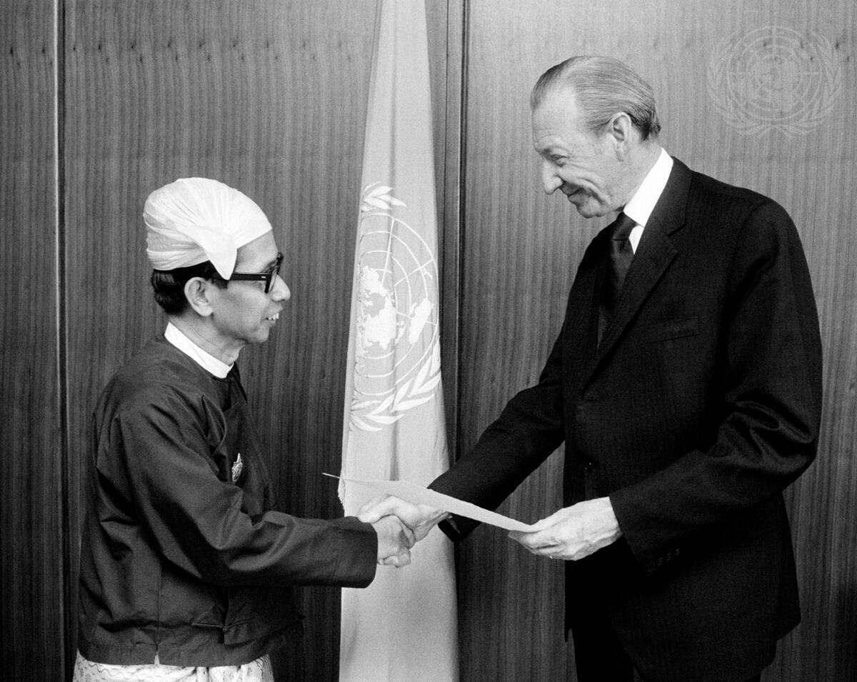 U Myint Maung, the new Permanent Representative of Burma to the United Nations, is seen presenting his credentials to Secretary-General Kurt Waldheim at United Nations Headquarters today.