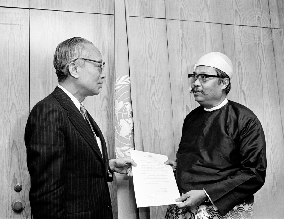 U Lwin (right), the new Permanent Representative of Burma to the United Nations, is seen presenting his credentials to Secretary-General U Thant at United Nations Headquarters today.