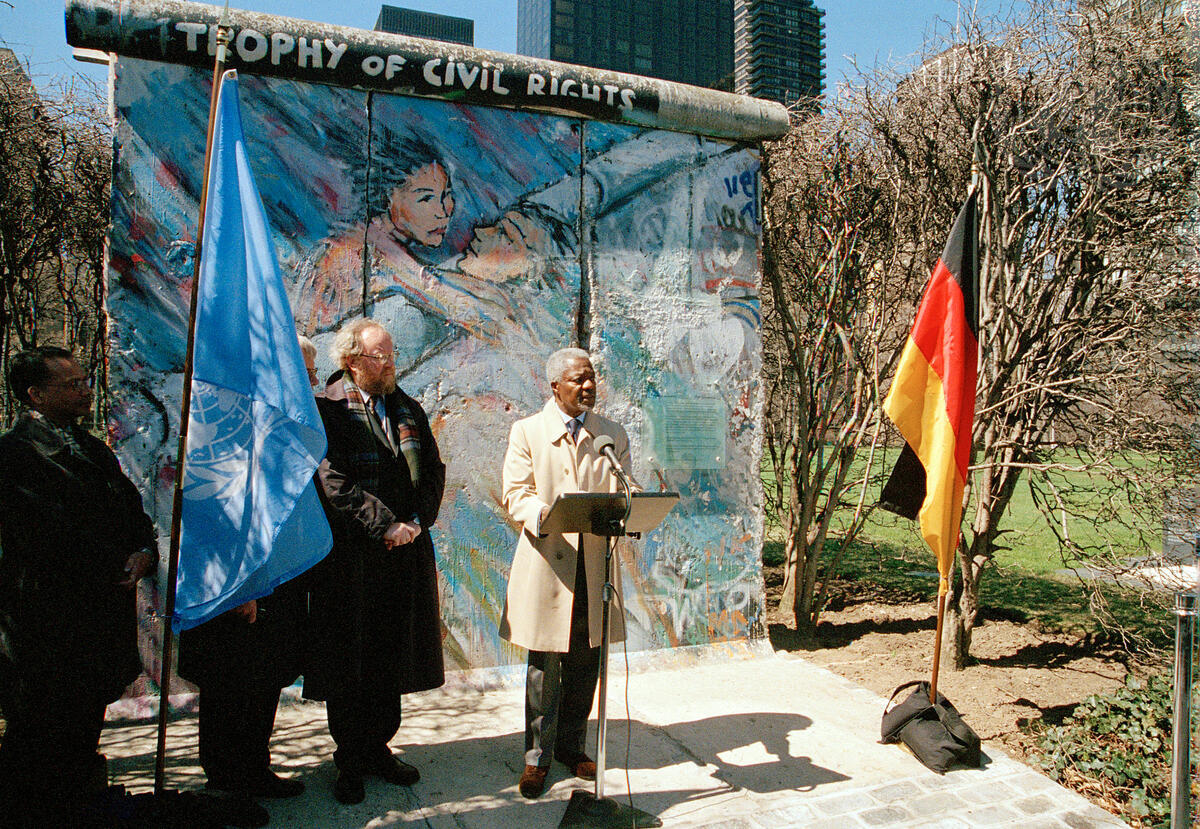 The Federal Republic of Germany presented a gift of three segments of the ""Berlin Wall"" to the United Nations today. The presentation took place at the North Garden.