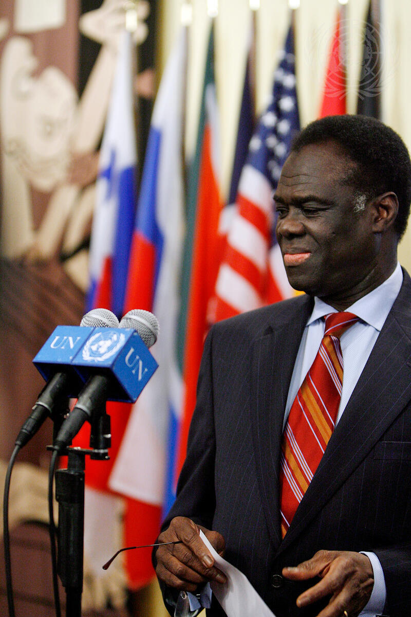 Michel Kafando, Permanent Representative of Burkina Faso to the United Nations and President of the Security Council for September, briefs the press following a Security Council meeting on the situation in the Middle East, and the Palestinian question.