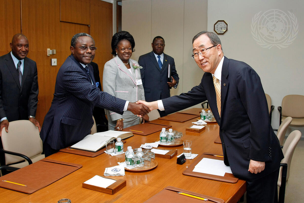 Secretary-General Ban Ki-moon (right) shakes hands with Didjob Divungidindinge, Vice-President of Gabon.