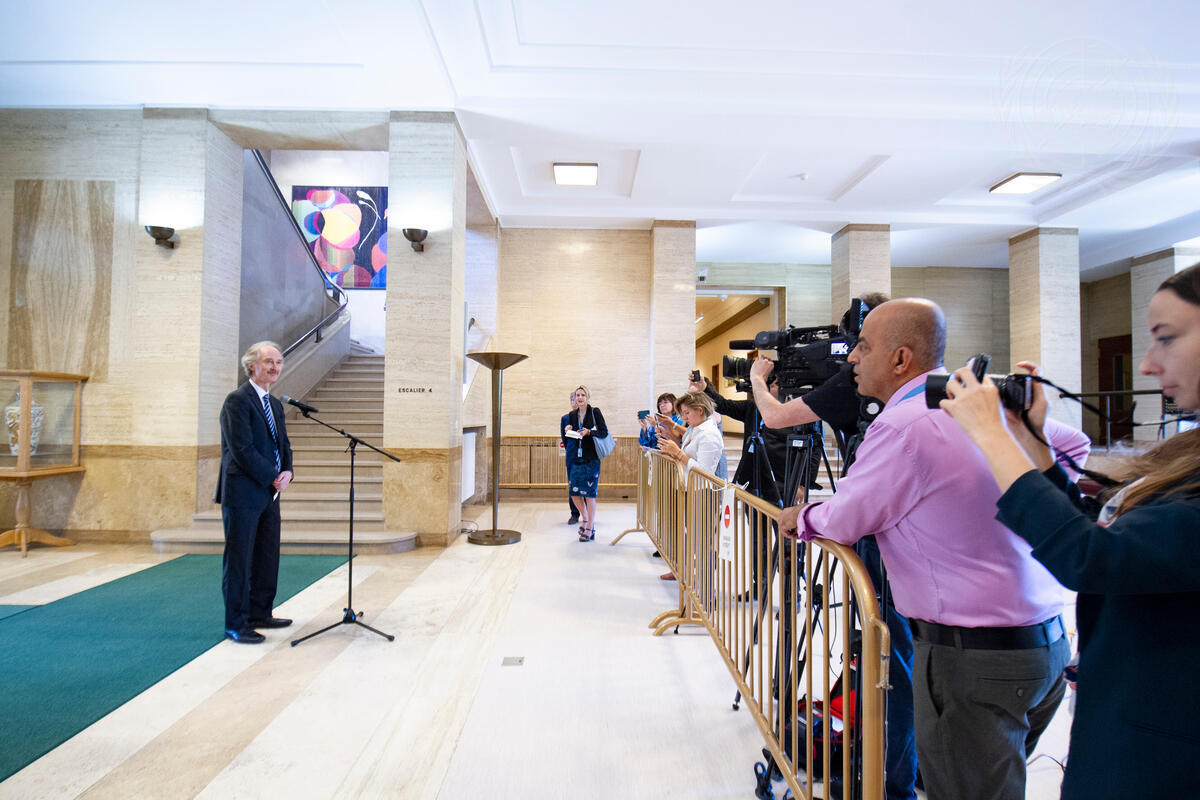 Geir O. Pederson, Special Envoy for Syria, briefs press after hosting a meeting for senior officials in Geneva.