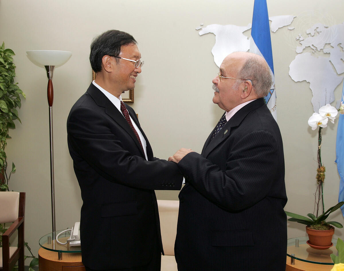 Miguel d'Escoto Brockmann (right), President of the sixty-third session of the General Assembly, meets with Yang Jiechi, Minister for Foreign Affairs of the People's Republic of China.