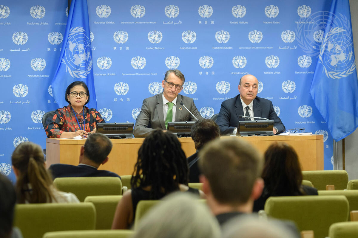 Caption Description Shantanu Mukherjee (right), Chief of the Integrated Policy and Analysis Branch of the Division for Sustainable Development of the UN Department of Economic and Social Affairs, along with Co-chairs of the Global Sustainable Development Report 2019, Peter Messerli (centre), Director of the Centre for Development and Environment at the University of Bern in Switzerland and Endah Murniningtyas, former Deputy Planning Minister of Indonesia, brief journalists on the report as guests at the noon briefing.