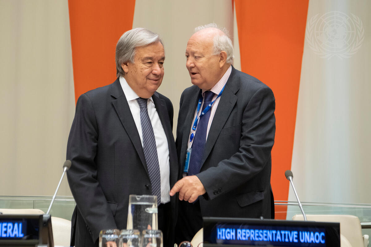 Secretary-General António Guterres (left) speaks with Miguel Ángel Moratinos, High Representative for the United Nations Alliance of Civilizations (UNAOC) ahead of the informal briefing on the ""United Nations Plan of Action to Safeguard Religious Sites: In Unity and Solidarity for Safe and Peaceful Worship"".