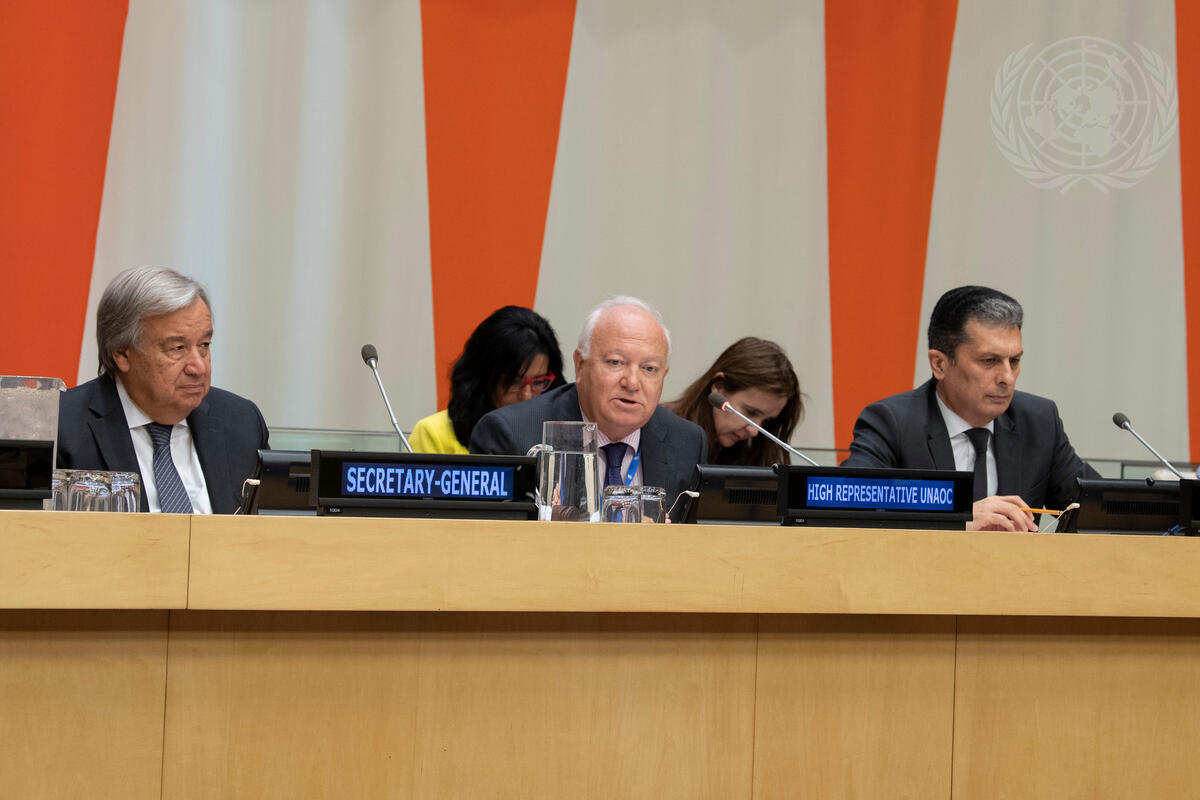 Miguel Ángel Moratinos (centre), High Representative for the United Nations Alliance of Civilizations (UNAOC), speaks at the informal briefing on the ""United Nations Plan of Action to Safeguard Religious Sites: In Unity and Solidarity for Safe and Peaceful Worship"". At left is Secretary-General António Guterres, and at right is Movses Abelian, Under-Secretary-General for General Assembly and Conference Management.