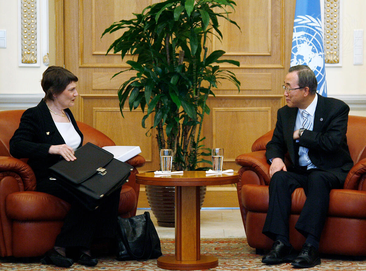 Secretary-General Ban Ki-moon (right) during a bilateral meeting with Helen Clark, Prime Minister of New Zealand.
