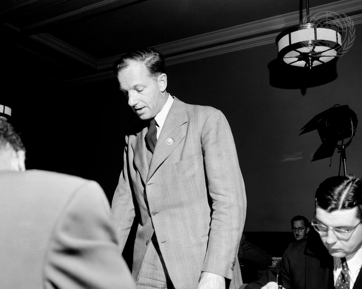 Commission IV, Committee 1 (Judicial Organization, International Court of Justice). Haakon Chevaliar, translator, speaks at the meeting. [No exact date]