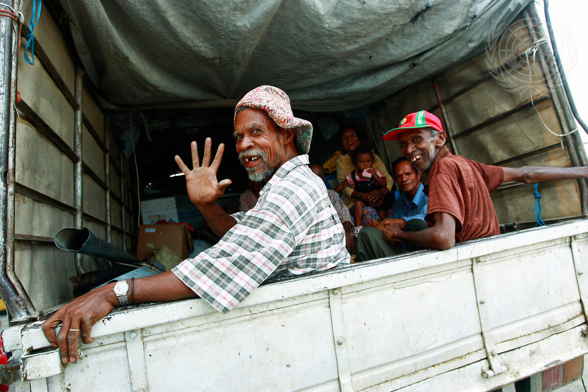Some of the internally displaced Timorese people wave at the start of their return journey home in the district of Ermera, with the assistance of the Ministry of Social Solidarity and the International Organization for Migration providing transport, and the United Nations Police, the Formed Police Units of Portugal and Pakistan, including the National Police of Timor-Leste providing security for the returnees.